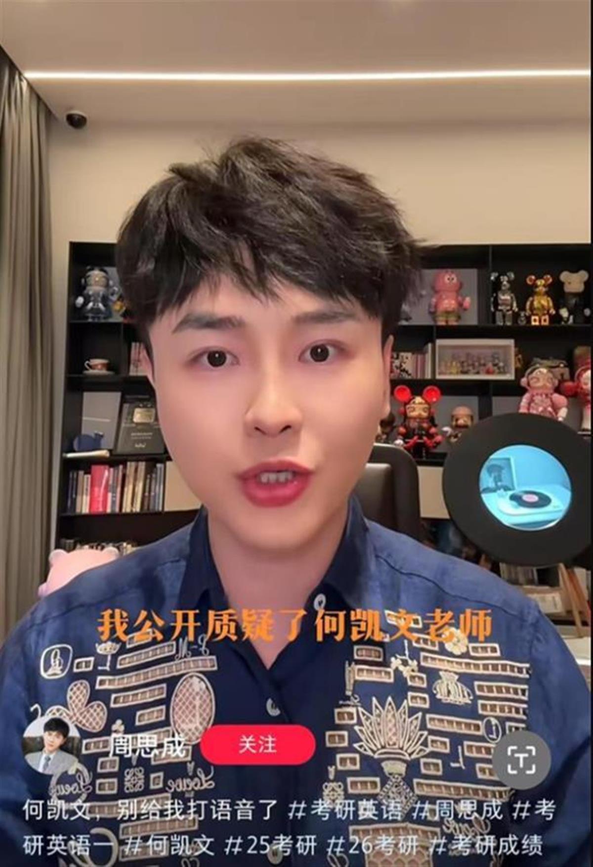 当天,周思成以“周思成公开质疑何凯文英一89为编造”为题发文。文章称,“我公开质疑何凯文今年考研英语一的89分数的截图、视频为P图和拼接。这事关老师的诚信问题。”“如果何老师真实分数为89,我会发视频道歉,然后置顶在所有平台。如果他告我我输了,我接受所有结果、赔偿。”